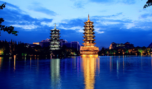 【日月双塔】建成于2002年,是在唐代佛塔基础上于2001年重建的,地处桂林市中心区,坐落在桂林城的中轴线、桂林杉湖岛上,与“象山水月”相邻。