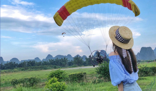 在阳朔燕莎热气球滑翔伞基地,可玩项目有热气球,如果不能去浪漫的土耳其,那就在阳朔体验一番吧,喜欢刺激的朋友可以乘坐滑翔伞哦!