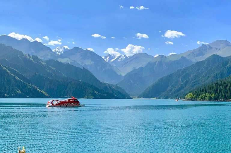 3️⃣抵达【天山天池】湖边后可游览【定海神针】、【南山望雪】、【西山观松】等,如当日天气晴好,可远眺天山雪峰【博格达峰】的神奇魅力。